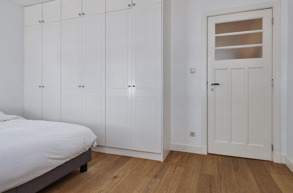 Spacious central hall, private access to the ground floor apartment. Hall with meter cupboard, door to the cozy living room (approx. 8.03 x 4.17 m) with beautiful oak lamellar parquet floor, luxurious open kitchen equipped with various appliances (including refrigerator, freezer, (combi) microwave, dishwasher, 6-burner stove with oven and extractor). From the living room patio doors to the sunny backyard (approx. 8.83 x 5.53 m) with beautifully landscaped terrace, wooden shed with electricity, parking and roofing with a connection point for an electric scooter or bicycle. This stylish apartment features two spacious bedrooms (approx. 4.33 x 2.71 and 3.85 x 3.80 m) both of which are equipped with built-in closets. Finally, the modern bathroom with walk-in shower, washbasin cabinet, underfloor heating, toilet and technical room with location for central heating boiler and washing machine.