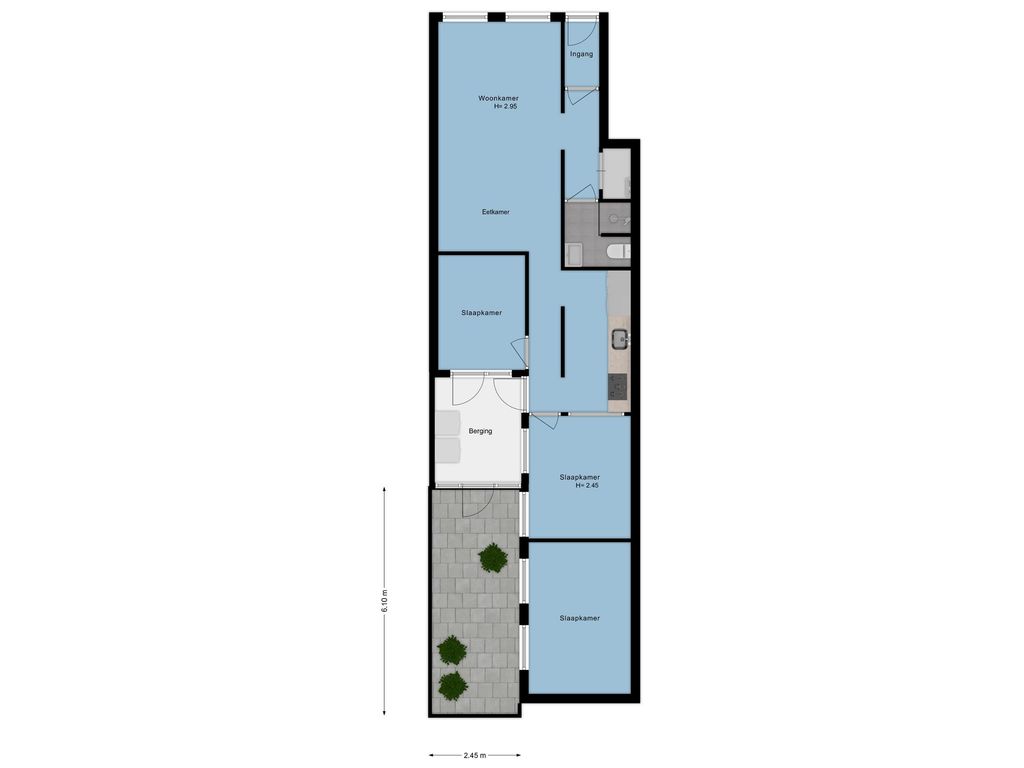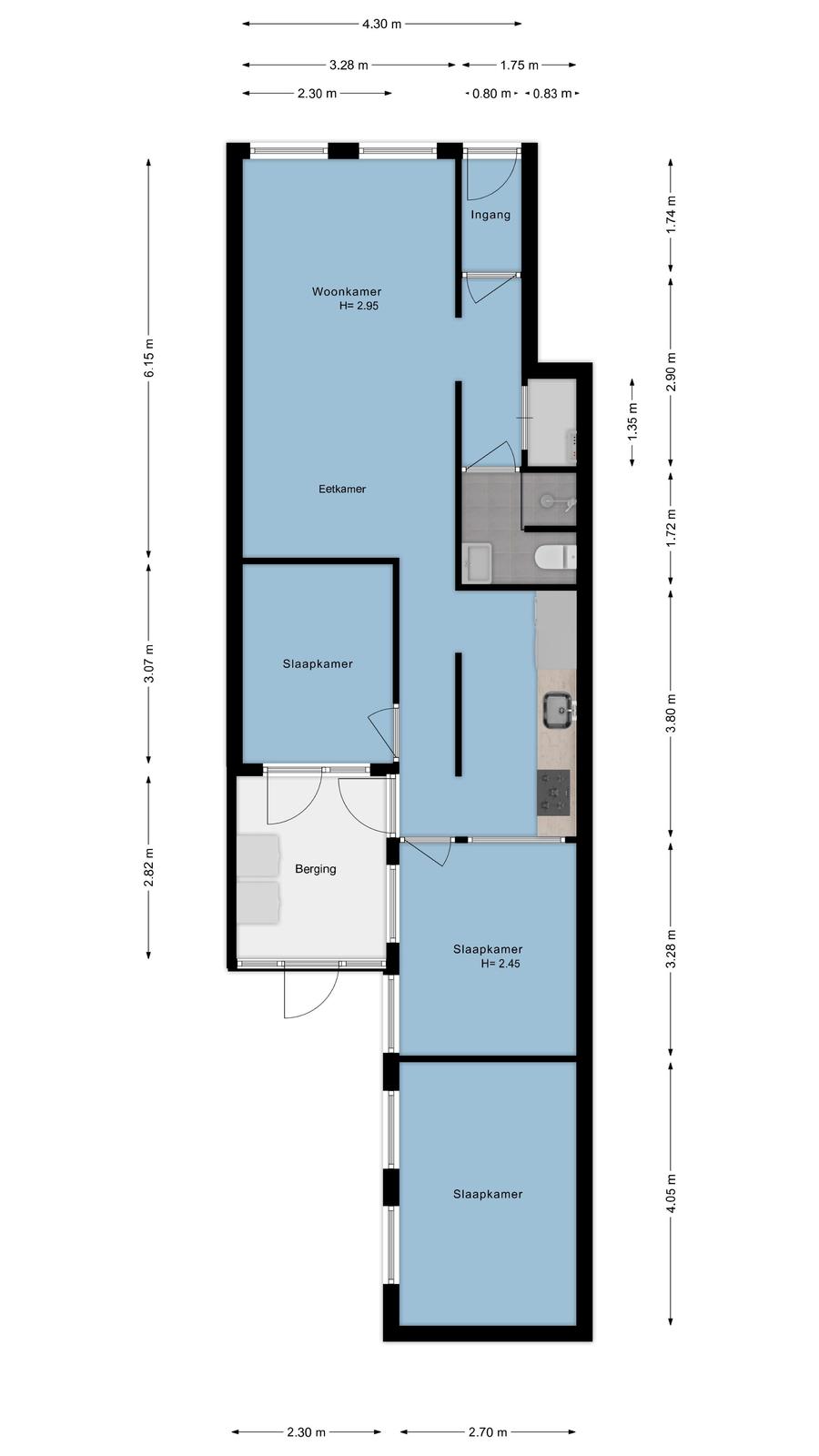 Entree, hal, gang met meterkast, ruime woon-/eetkamer (ca. 6.15 m x 3.28 m, een fraaie, half open keuken met diverse apparatuur ((vierpits gaskookplaat, koel-/vriescombinatie, vaatwasmachine, oven en een afzuigkap) en tussengelegen badkamer (ca. 1.72 x 1.75 m) met douche, wastafelmeubel en een toilet. Aan achterzijde heeft het 3 slaapkamers (resp. ca. 3.07 x 2.30 m, 3.28 x 2.70 m en 4.05 x 2.70 m). Via de slaapkamer toegang tot de riante berging (ca. 2.82 x 2.30 m) en de zonnige achtertuin (ca. 6.10 x 2.45 m) gelegen op het zuidwesten.